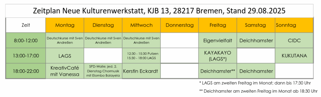 Die Neue Kulturenwerkstatt bietet einen interkulturellen Raum für deine Projekte und dein Engagement. Mach mit! Es gibt noch freie Slots in unserem „Kulturbetrieb“.