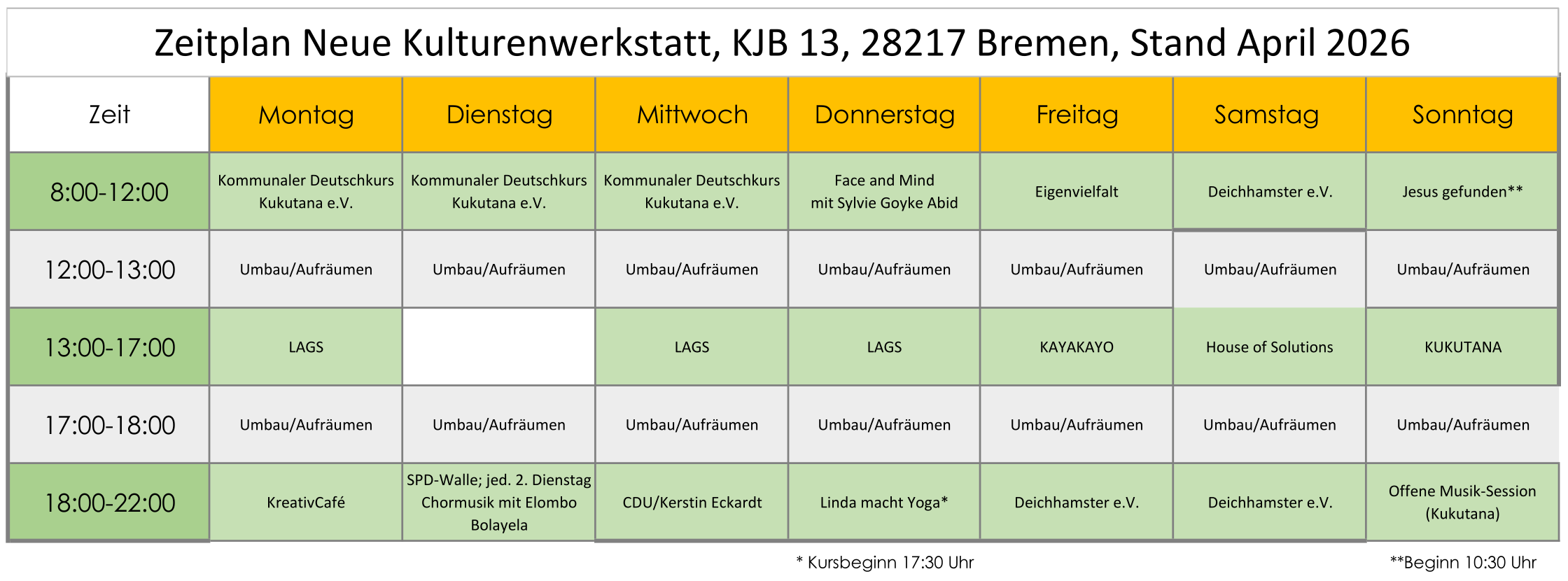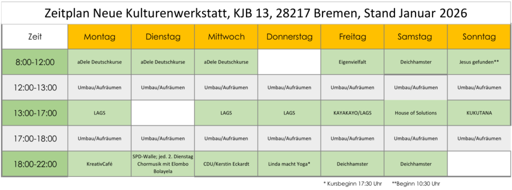 Wer zusammenarbeitet, kommt weiter und in der Neuen Kulturenwerkstatt kommen Menschen und Ideen in der Bremer Überseestadt zusammen. Von Afrika bis zum Waller Sand, von Gospel bis Yoga in einer starken Gemeinschaft und vielleicht auch bald mit dir.