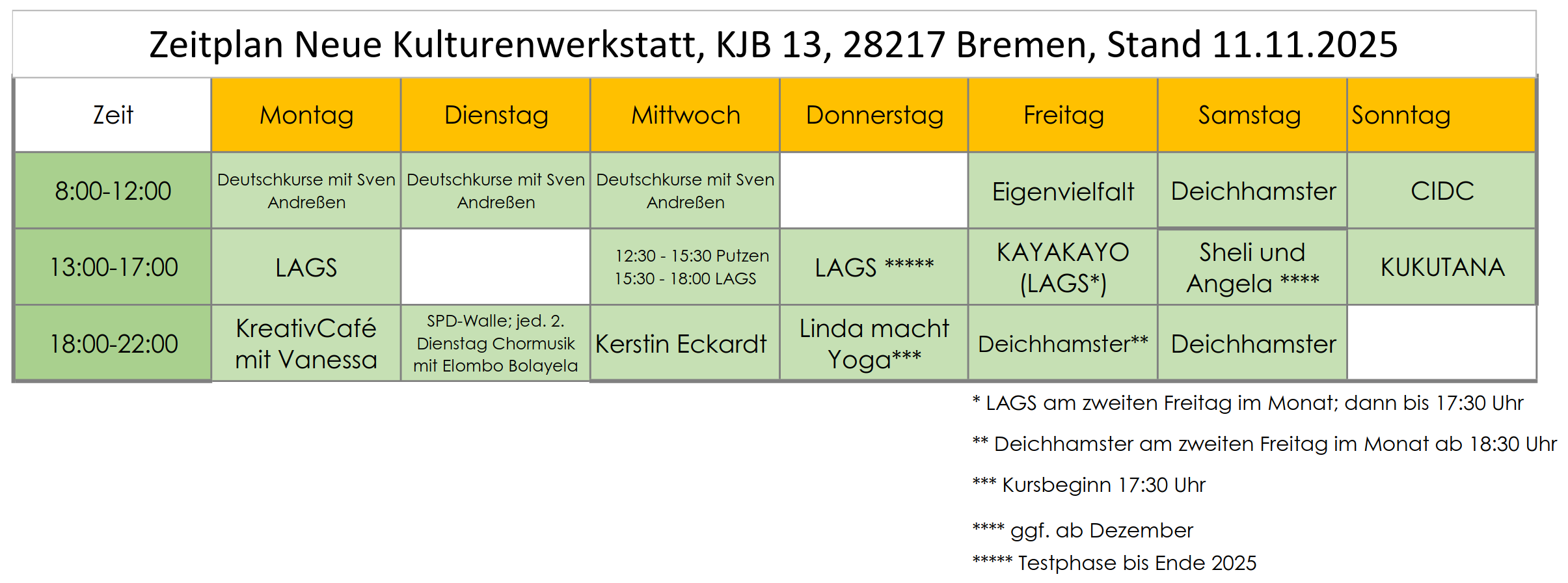 bietet jeden Freitagabend sowie Samstagvormittag und -abend die Möglichkeit zum Klönschnack und weiteren Aktivitäten wie Spieleabende, Bewegungsangebote (u.a. Radtouren), Weiterbildung, z. B. Handynutzung für Senioren sowie Kultur- und Bildungsangebote.